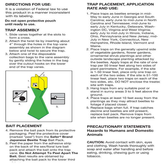 The Safer Brand Replacement Bait for the Safer Brand Japanese beetle trap uses a food and sex attractant to lure insects into the trap and disrupt the mating cycle of Japanese Beetles. A special chemical lure is placed near the top of the trap. Sexual activity of the Japanese beetle is greater in June in Southern states and July in Northern states.